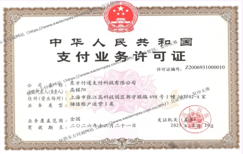 (上图为东方付通支付许可证)